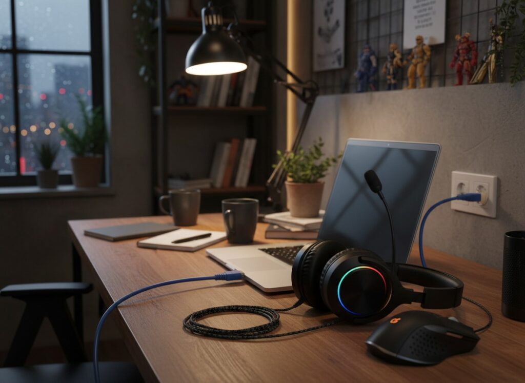 - Kabelgebundenes Zubehör: Headset, Tastatur, Maus.
